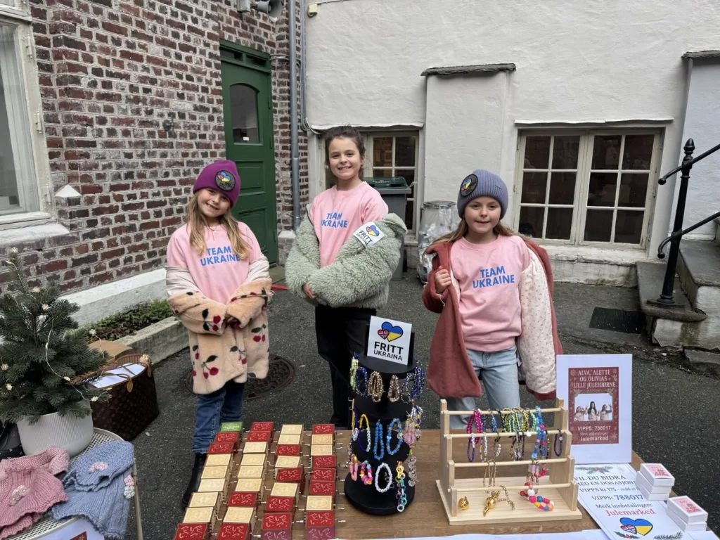 Corinne Silden Stephensens tre døtre var ivrige selgere og flotte ambassadører for Fritt Ukraina. Foto: Corinne Silden Stephensen