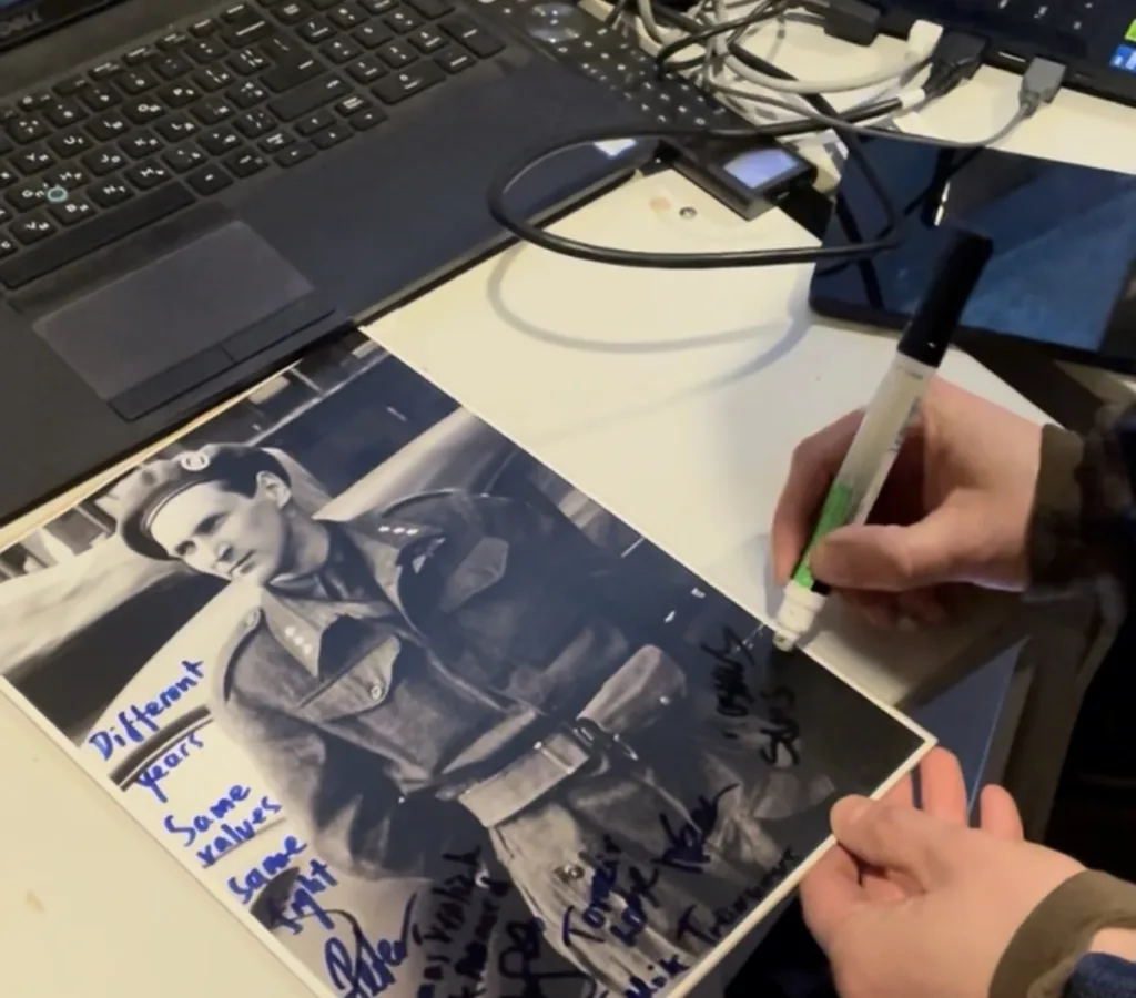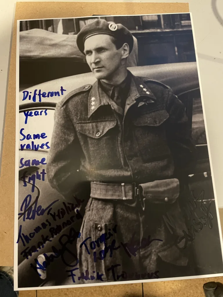 Magnus Sønsteby signerer bildet av bestefaren. Foto Fritt Ukraina