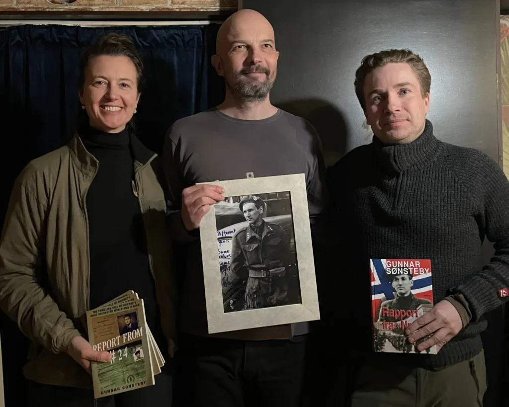 Natalia Golis, Yehor og Magnus Sønsteby med bildet av Gunnar Sønsteby og boken “Rapport fra Nr 24”. Foto: Fritt Ukraina